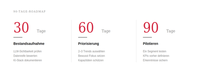 Auf Basis der Bestandsaufnahme lässt sich einschätzen, welche zwei oder drei Trends für das eigene Geschäftsmodell den grössten Hebel haben. Genauso wichtig ist die bewusste Entscheidung, welche Trends erst später angegangen werden. Ein Industrieunternehmen mit komplexen Produktdaten wird Agentic Marketing und GEO höher priorisieren als Social Commerce. Ein Retail-Unternehmen setzt andere Schwerpunkte.