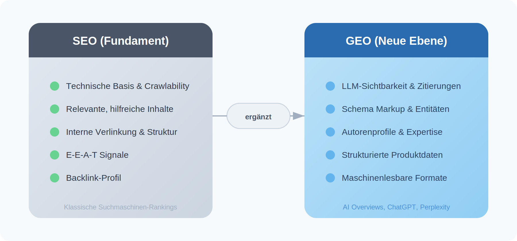 Eines vorweg: GEO ersetzt SEO nicht. Klassische Suchmaschinenoptimierung bleibt das Fundament. Ohne saubere Technik, ohne relevante Inhalte, ohne eine crawlbare Seitenstruktur wird auch kein LLM eine Website als Quelle heranziehen. Was sich verändert, ist die Sichtbarkeitsebene, die dazukommt.