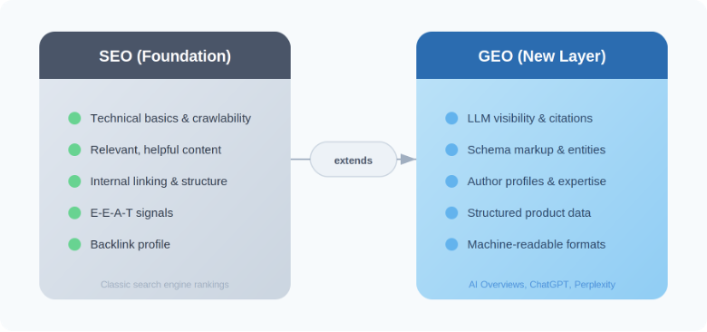 One thing first: GEO doesn’t replace SEO. Classic search engine optimisation remains the foundation. Without clean technology, relevant content and a crawlable site structure, no LLM will cite a website as a source. What’s changing is the visibility layer added on top.