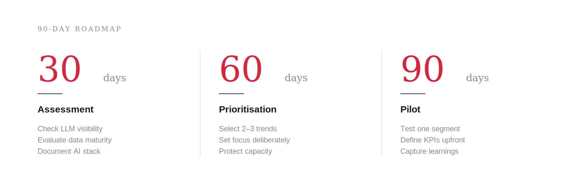 Instead of rolling out broadly, we recommend starting with a clearly scoped pilot. One product segment, one audience, one channel. With success metrics defined in advance.